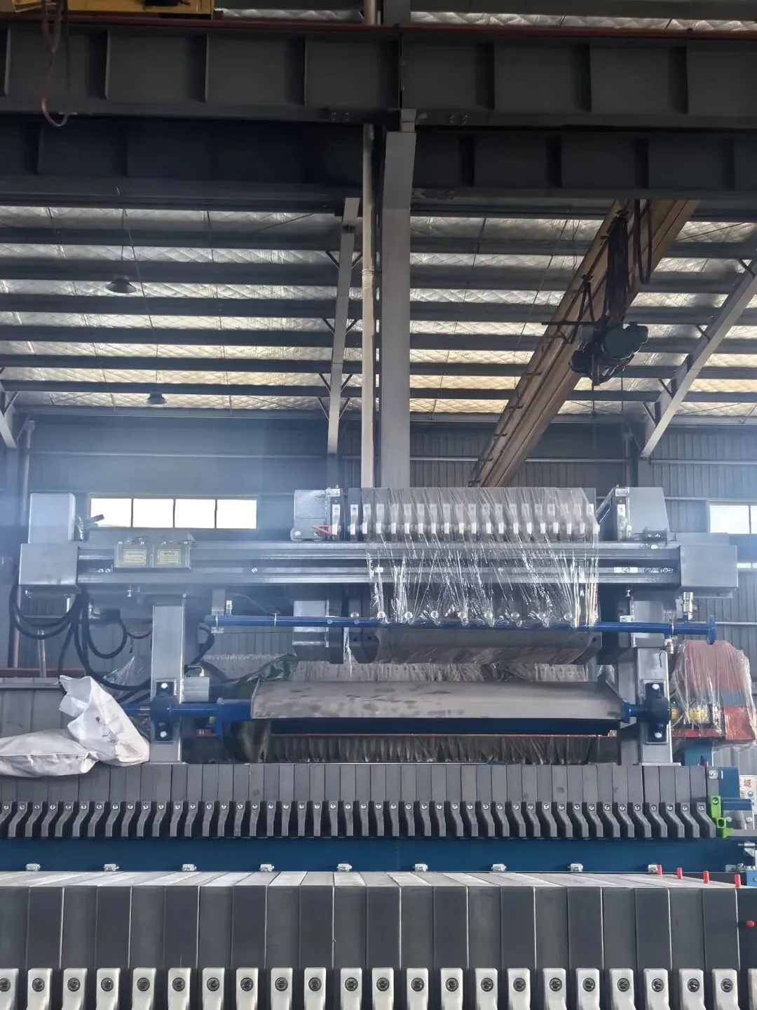 2. 滤板动作时严禁伸手操作:压滤机处于滤板压紧、拉板作业状态时,严禁将手伸入滤板之间整理滤布。滤板压紧、拉板过程中存在较大机械挤压力,伸手操作极易造成手部挤压、夹伤等人身损伤。若作业过程中需整理滤布,必须先停止压紧或拉板动作,待设备完全停机、滤板处于静止状态后,再进行相关操作。