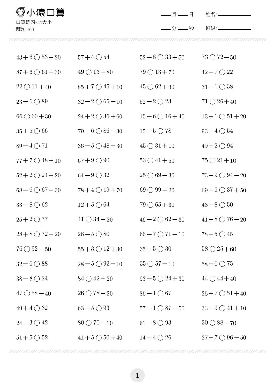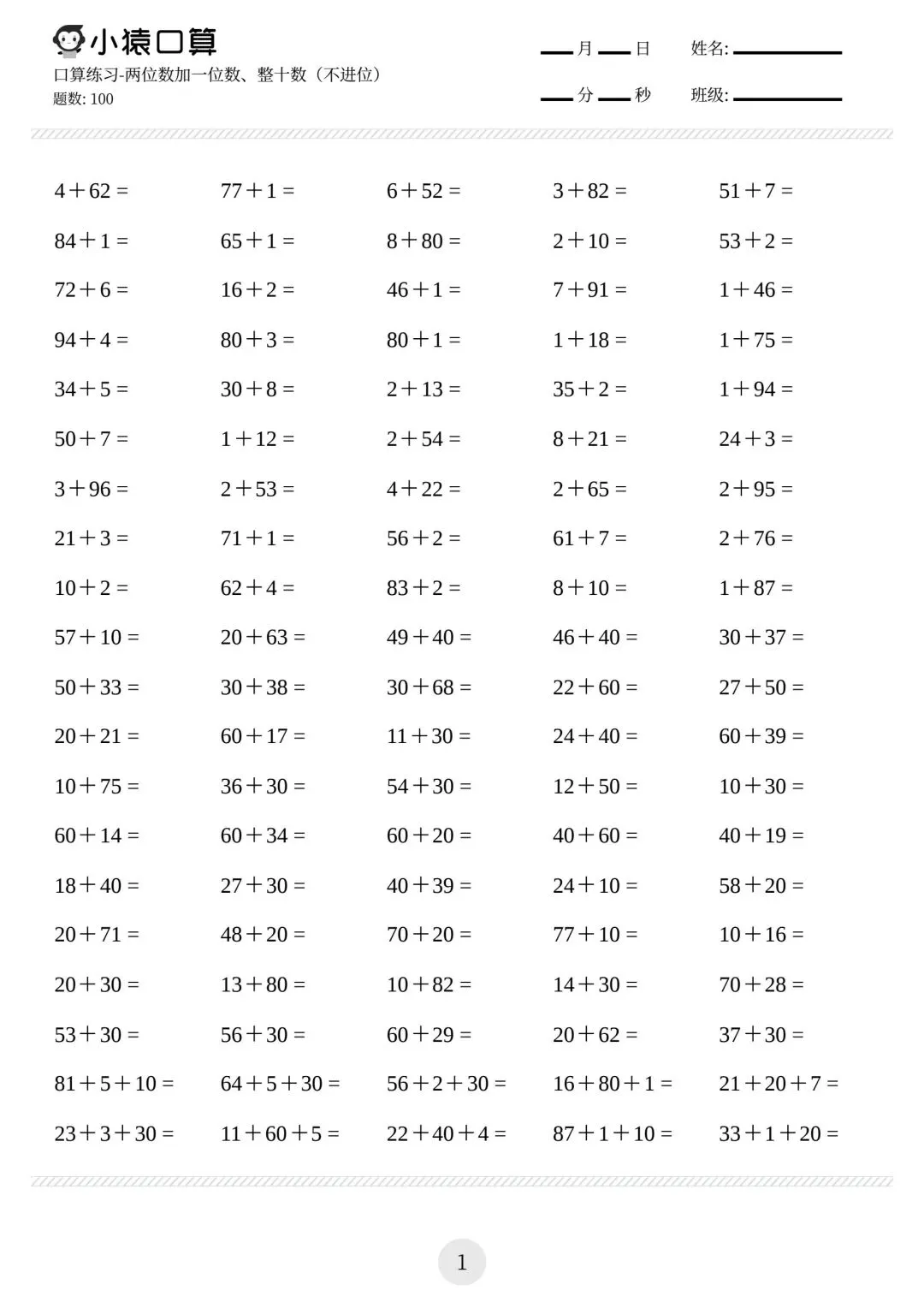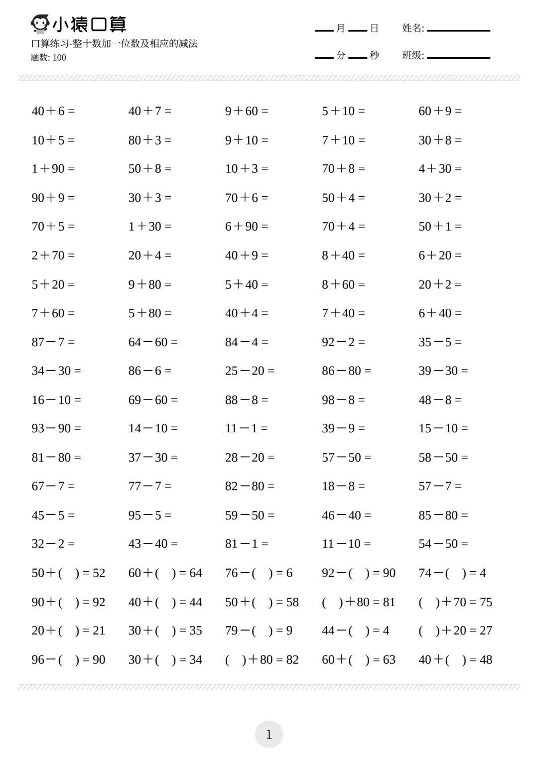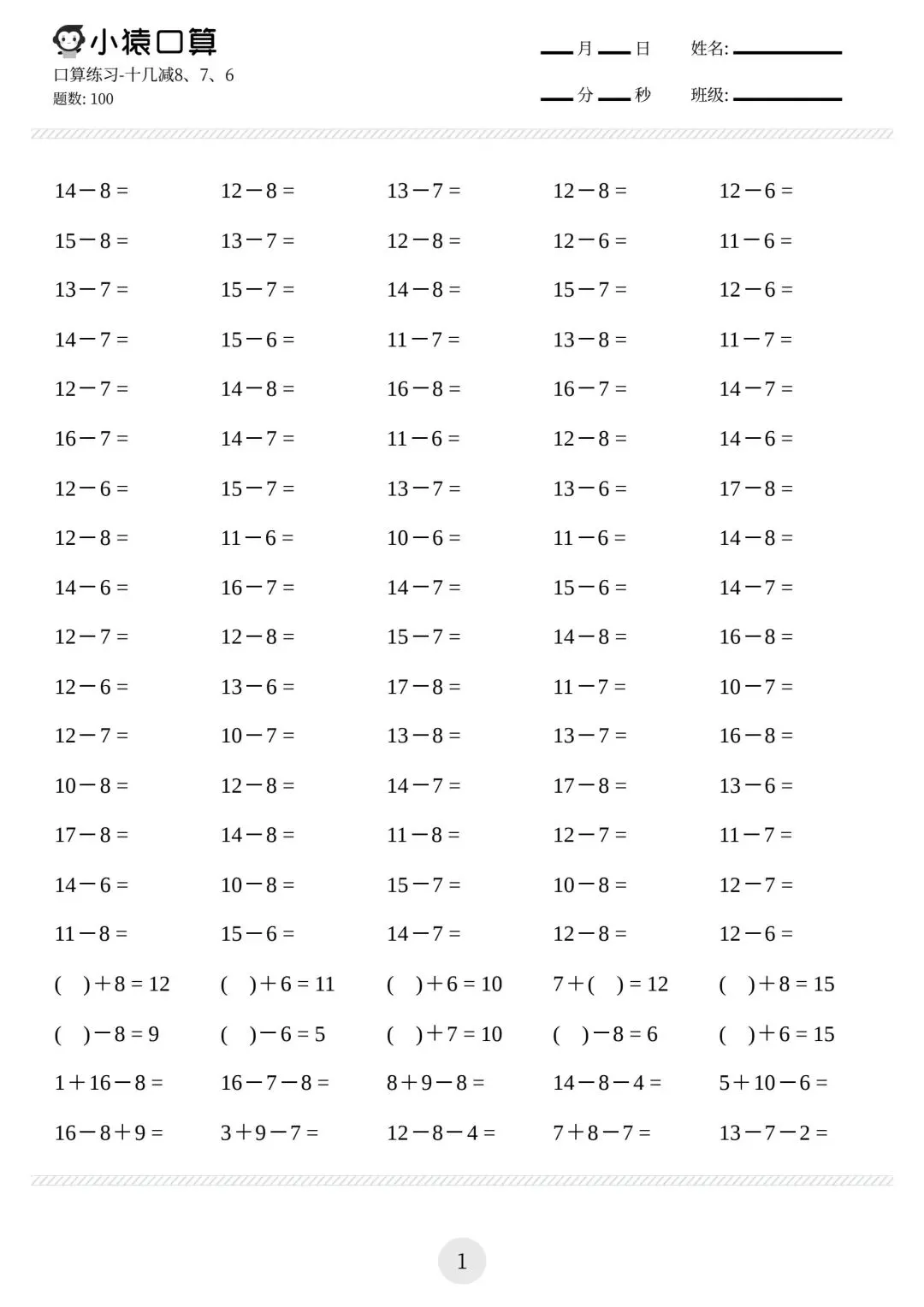 一年级小猿口算练习题,电子版可下载免费