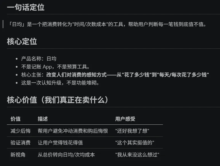 最后产出了一份产品文档,把定位、用户画像、核心功能、版本规划都写清楚了。