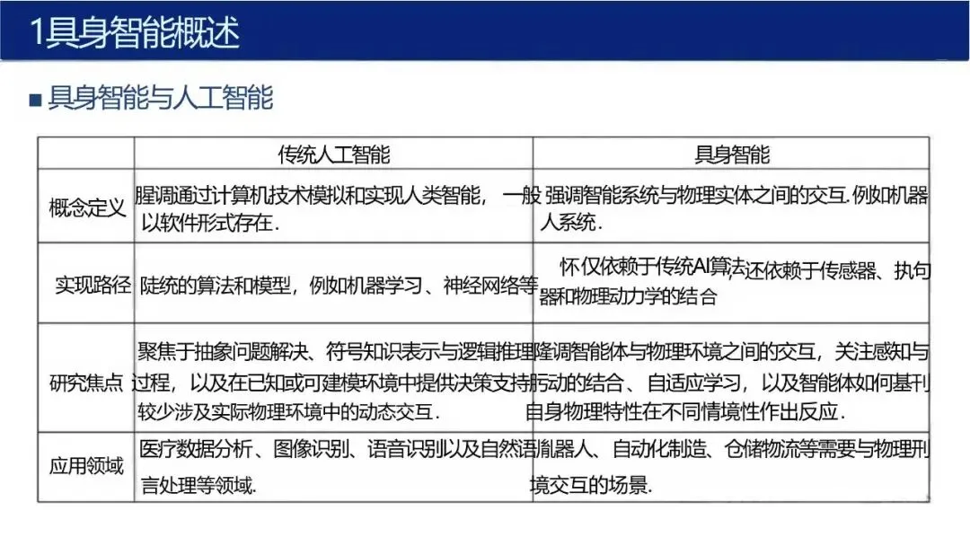 从核心定义来看,具身智能是拥有物理形态、可直接与物理世界交互的智能系统,依托智能体、本体、数据、具身学习四大要素,构建 “感知 – 决策 – 行动” 闭环。区别于传统离身智能,它强调智能与身体、环境的深度耦合,广泛应用于机器人、自动驾驶等领域。