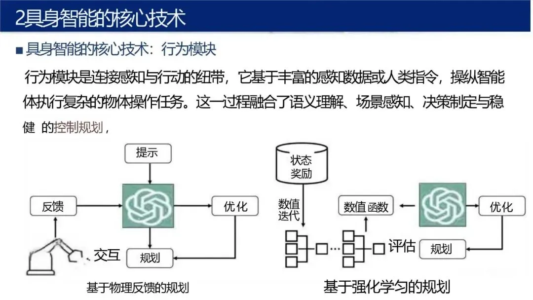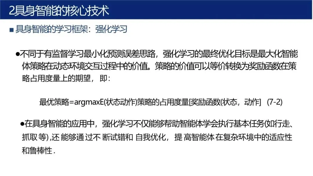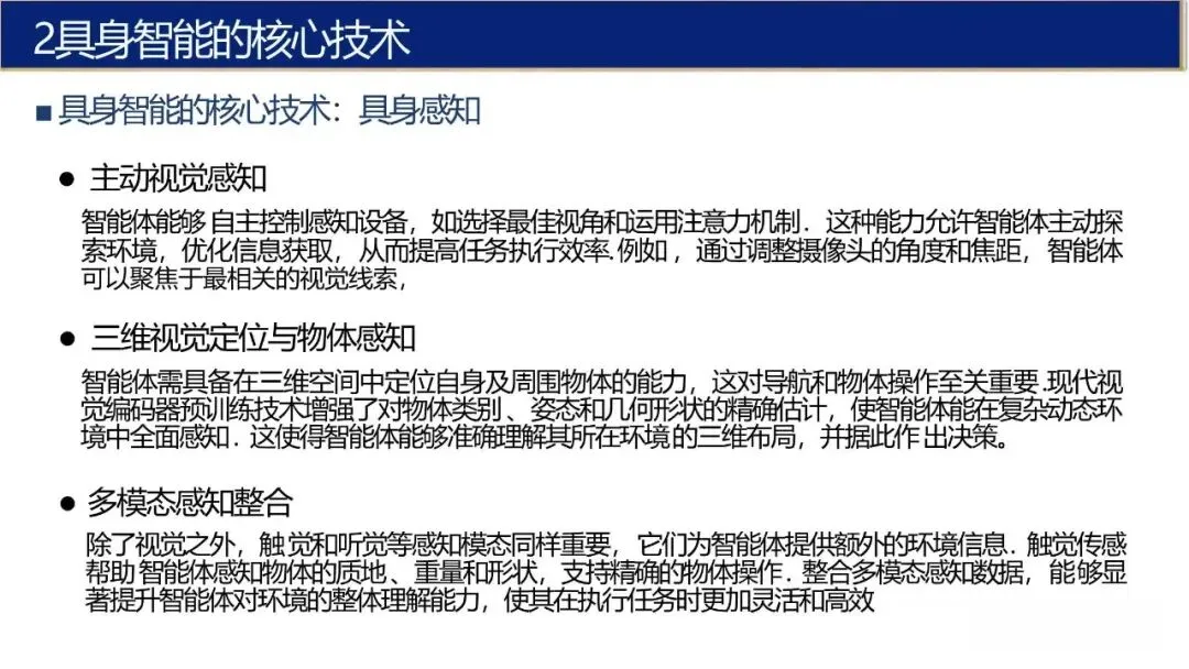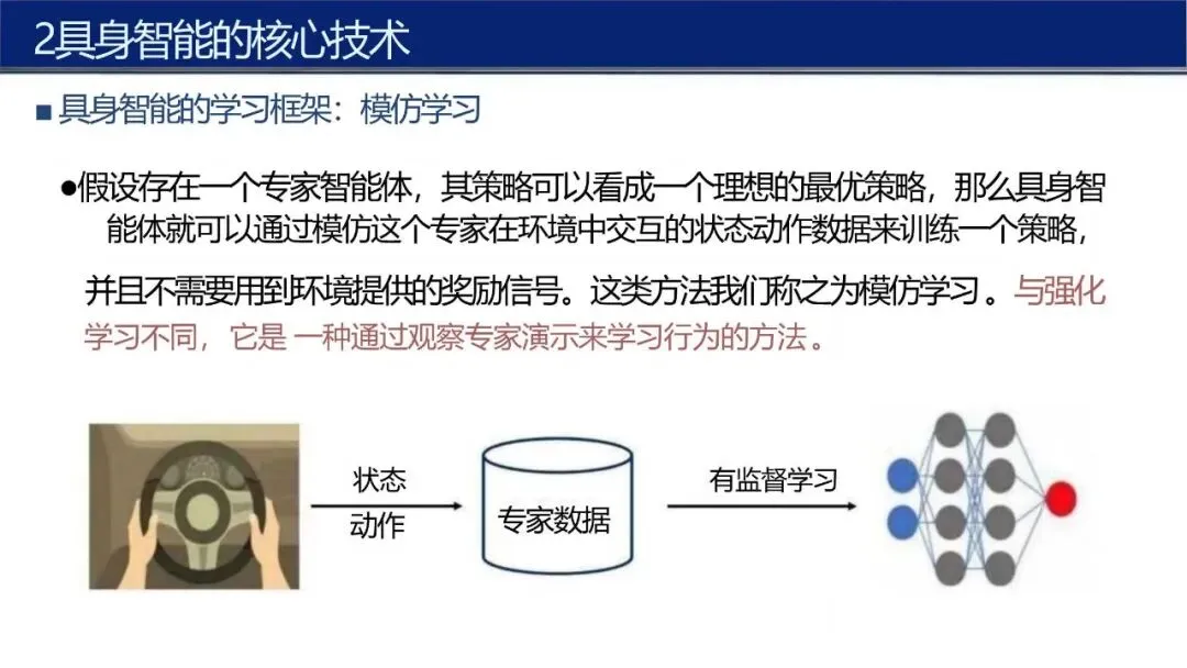 核心技术层面,具身智能围绕具身感知、行为模块、具身交互三大系统框架展开,融合主动视觉、三维定位、多模态整合等感知能力;通过强化学习、模仿学习实现智能体自主优化,借助 Sim2Real 仿真到真实迁移技术,打通虚拟训练与现实应用的壁垒。