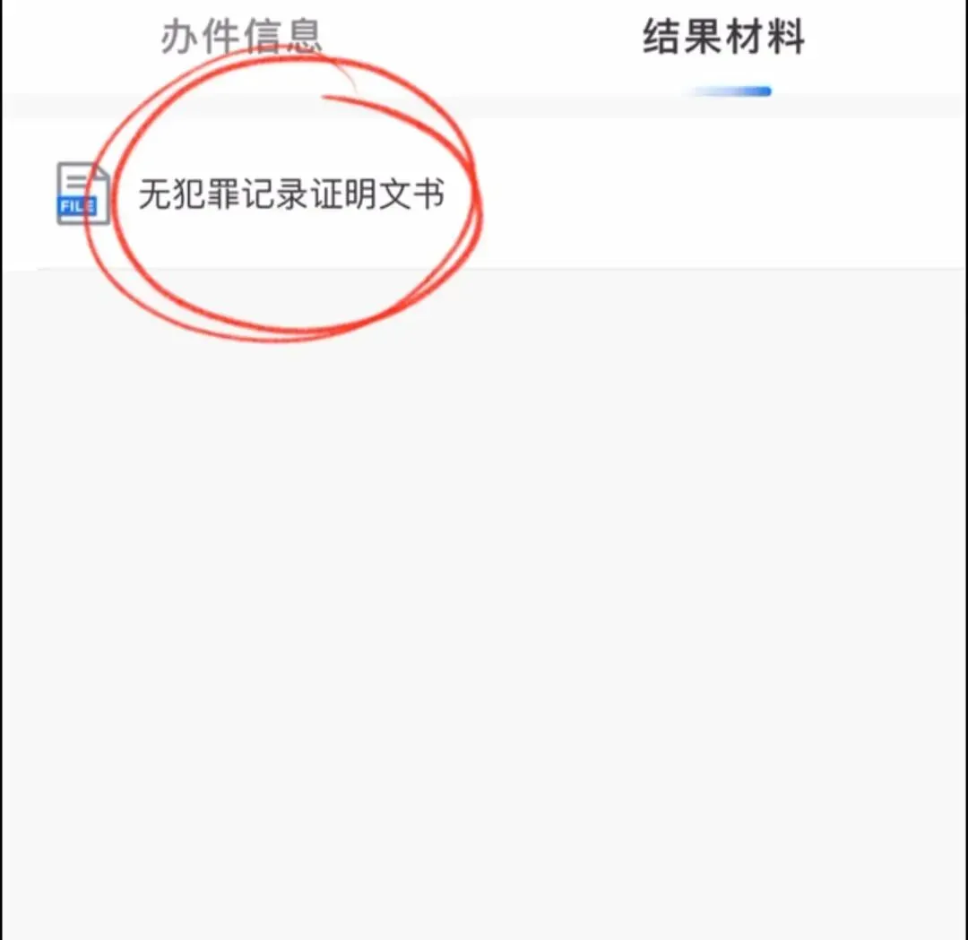 点击“结果材料”,获取无犯罪记录证明文书,电子版和纸质版中只能选择一个获取。
