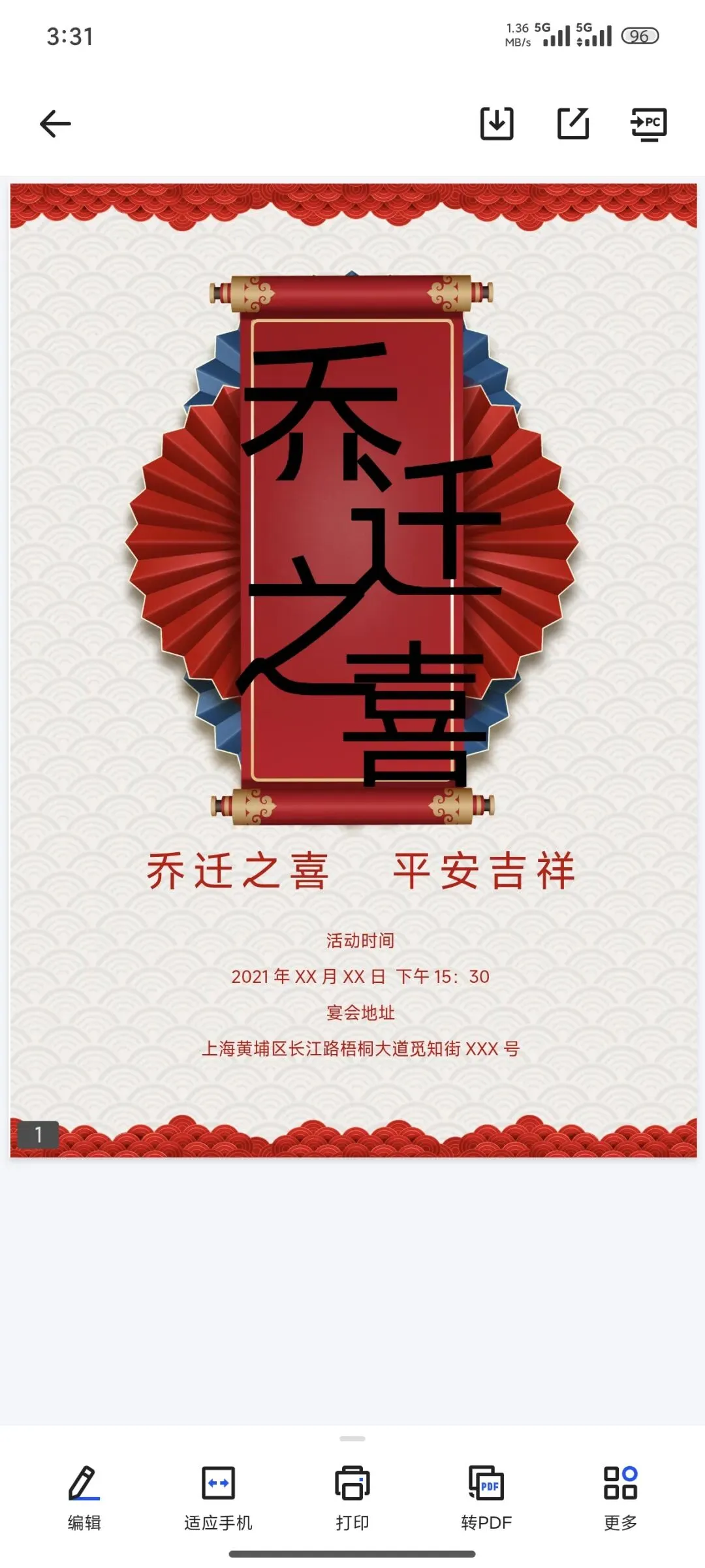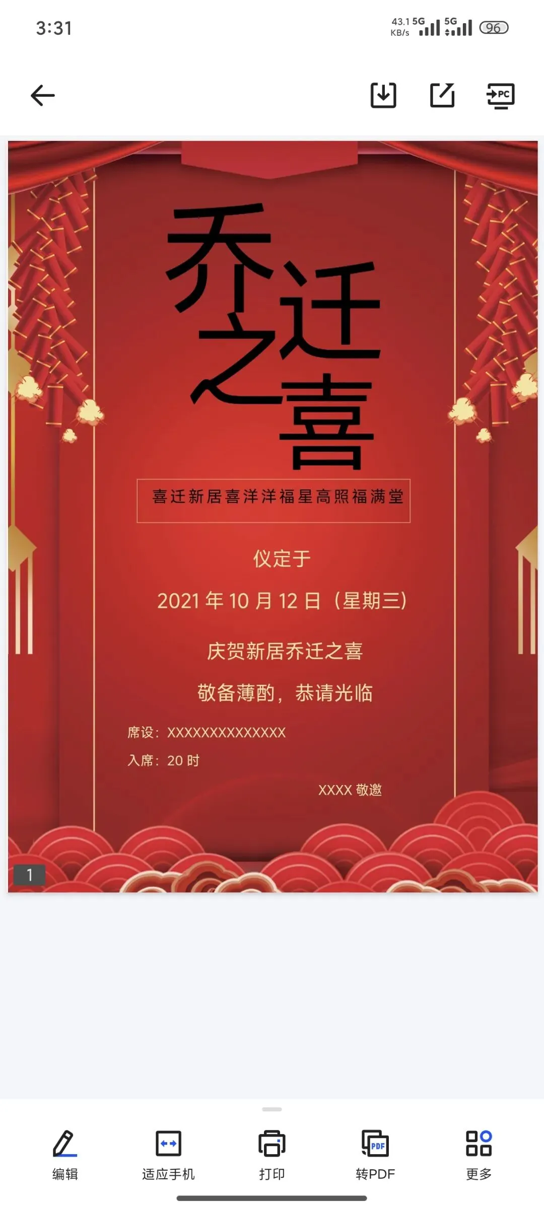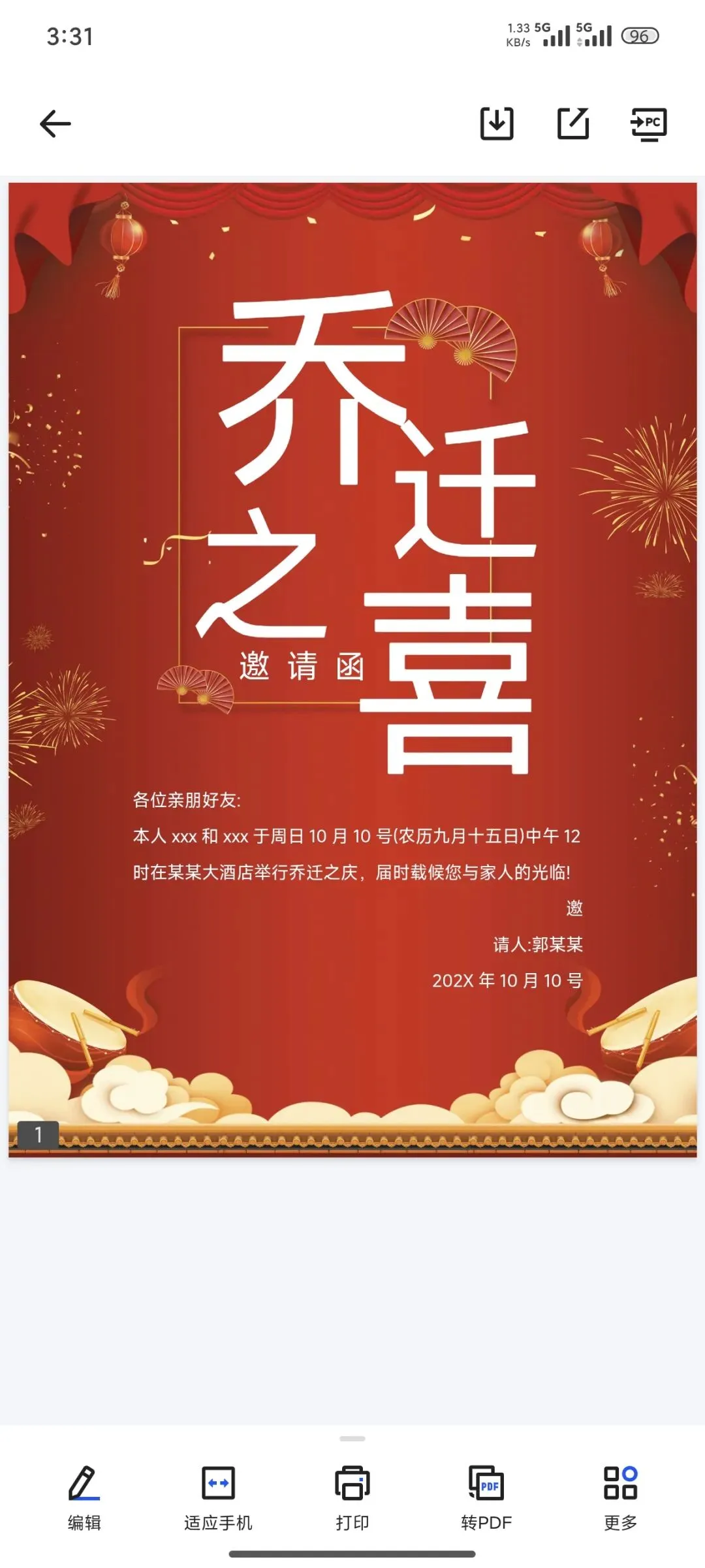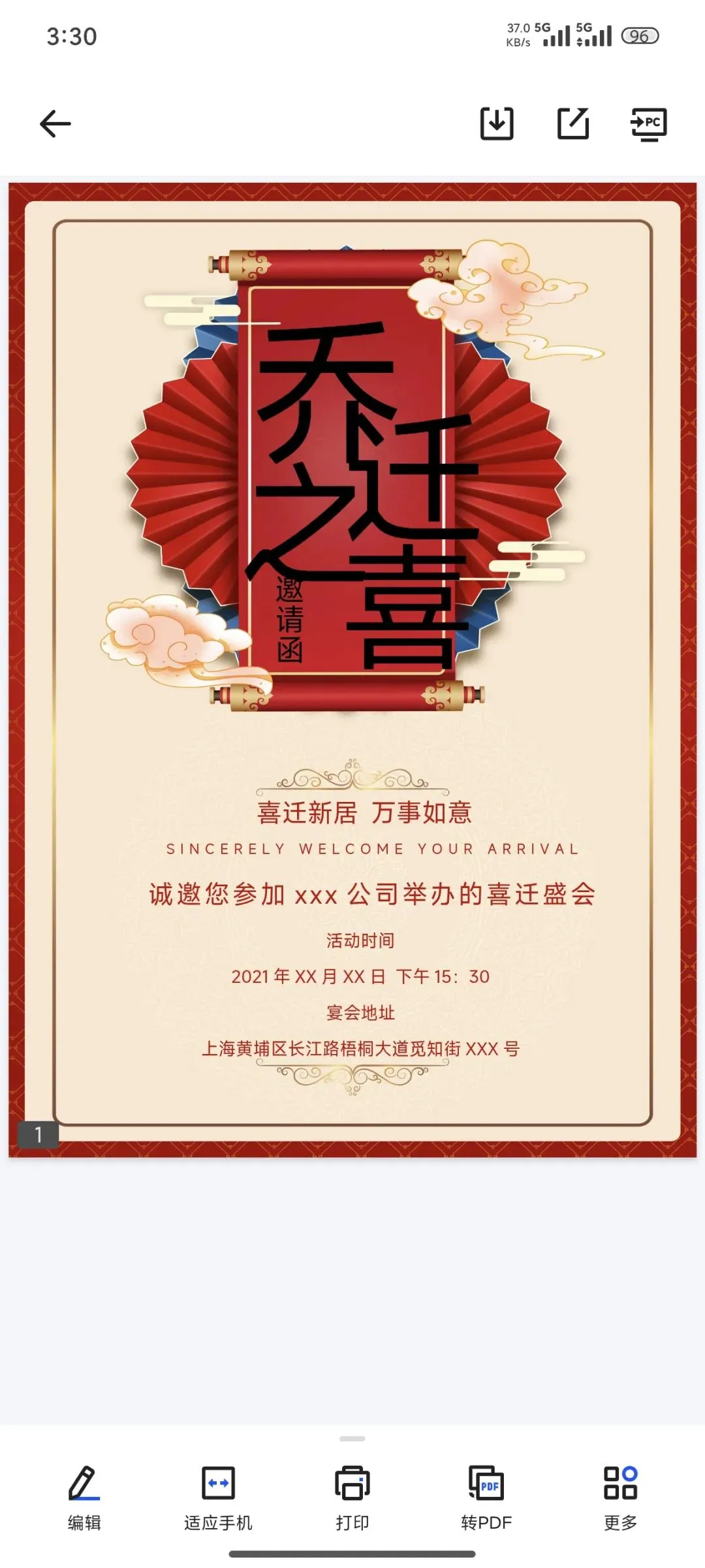 乔迁邀请函电子版(可打印编辑)
