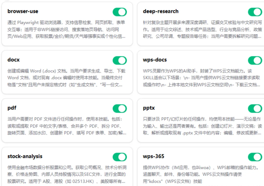 目前系统内置了WPS文档处理、PDF转换、PPT生成、Excel数据分析、浏览器自动化等办公高频技能。