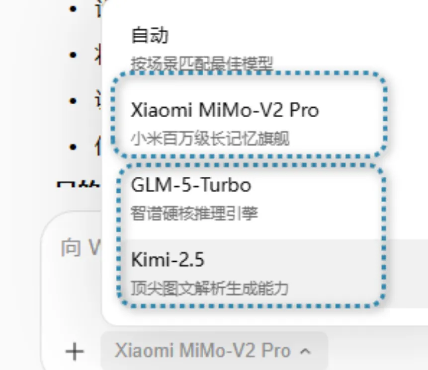 在模型选择层面,小米MiMo-V2-Pro的加入是个亮点。