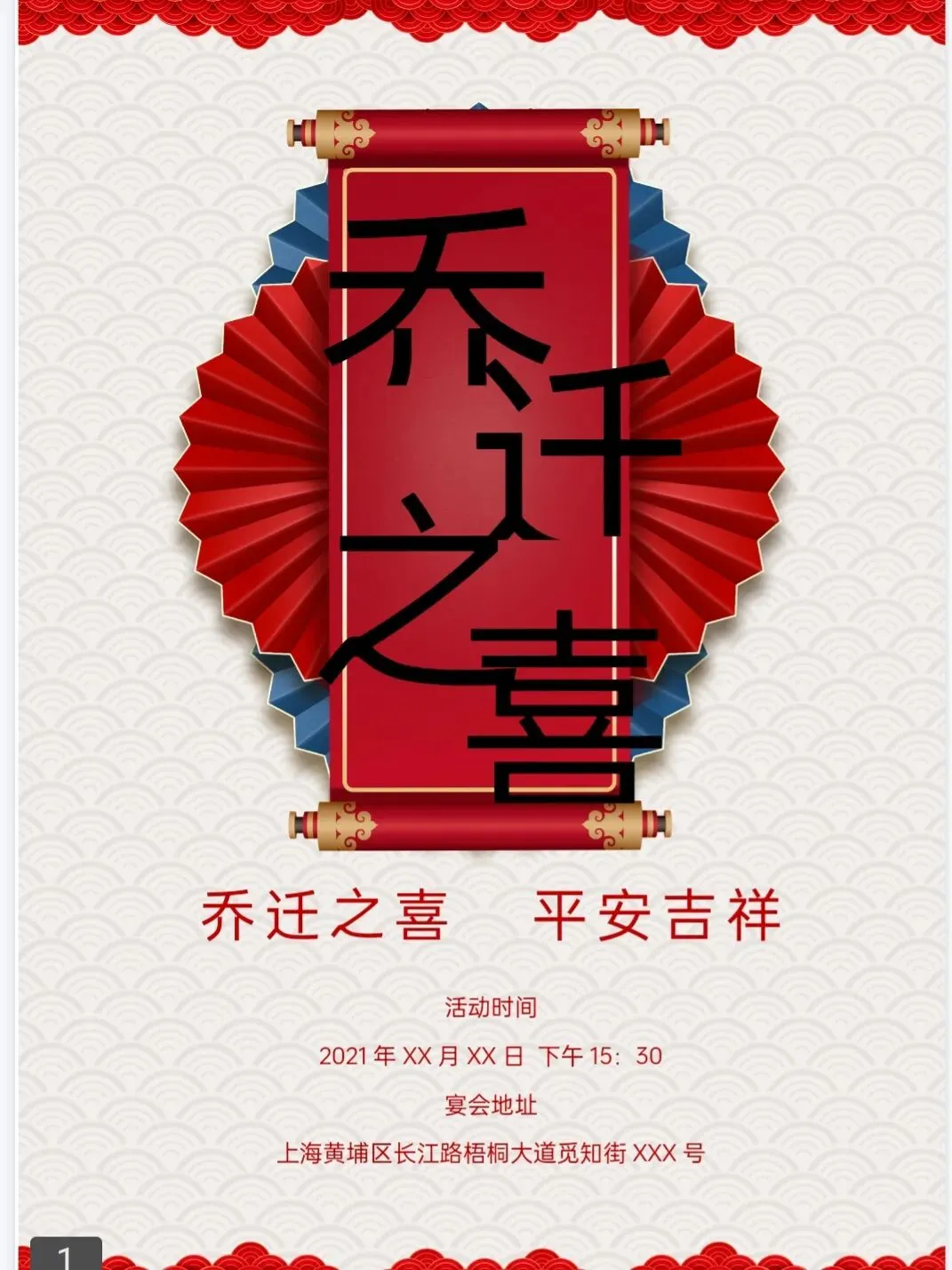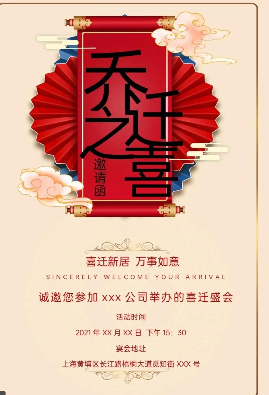 个人搬家、公司乔迁、新居暖居宴都能用,不用设计基础,替换信息即可生成。