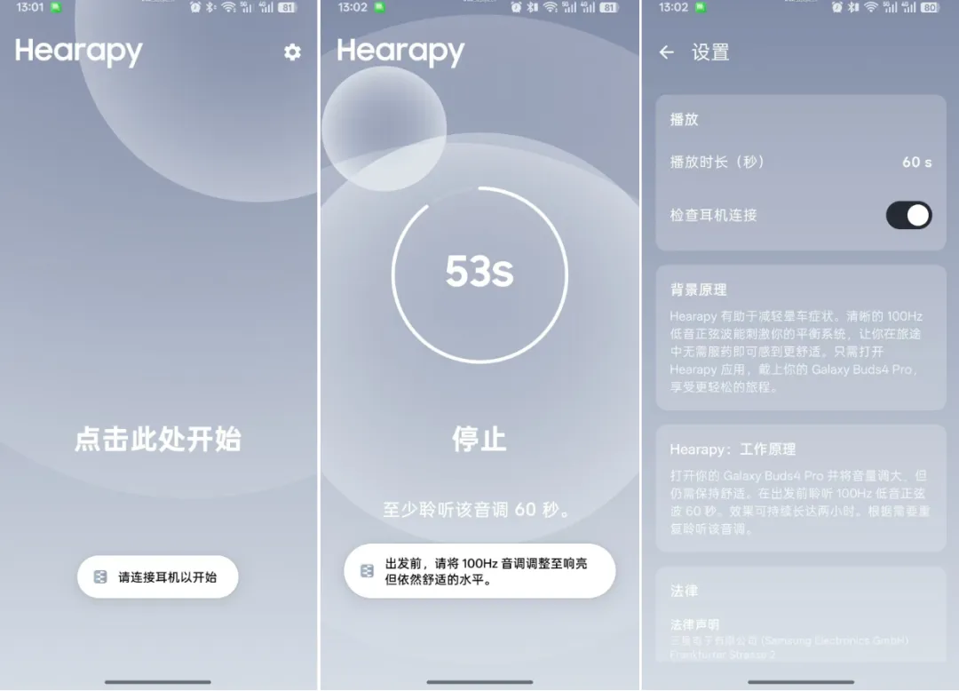 - Hearapy 是三星基于科研成果开发的非侵入性声音疗法工具,专为辅助缓解晕车、晕船、晕机等晕动症不适打造。