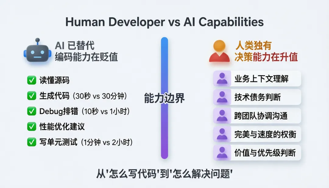 核心竞争力从”怎么写代码”变成了”怎么解决问题”。