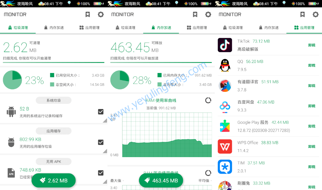 手机端的清理应用可谓是遍地开花,多种多样老夜也为大家推荐过不好优秀的同类软件,从(安卓)CCleaner Pro — 手机垃圾文件清理工具再到(安卓)猎豹清理大师去广告精简版都是计较经典实用的清理利器。随着国内手机大厂对系统优化开始重视,目前大部分手机出厂前系统均已内置自家特色的安全清理应用,作为属于系统深层应用权限较大清理效果也比第三方工具见效快,因此清理工具APP近几年一直被排挤,但是总有一些嫌自带清理功能不好用界面UI丑的强迫症用户,纷纷又重新用回了第三方。强力清理APP老夜初次接触就给人眼前一亮的感觉,首先就是绿色的界面风格眼睛看着特别舒服,版块与功能的相得益彰也让这款工具想的十分漂亮,如果是个有审美的玩机控来说,强力清理APP已经将颜值与功能兼得了。功能好不好用了才知道,但是给人影响最深的就是“好看”二字了,当然了这款工具也绝不是花瓶,功能也是毫不含糊!