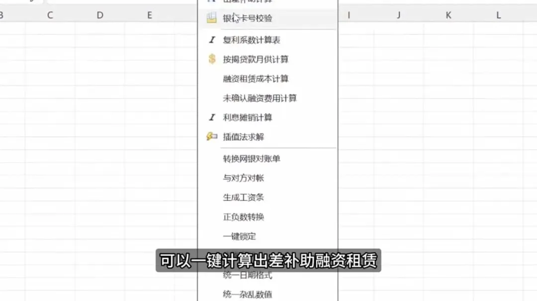 打开EXCEL表格 在菜单选项中会多出一个工具箱的选项卡 直接点击进入 在财税工具中可以一键计算出差补助 融资租赁 利息摊销等