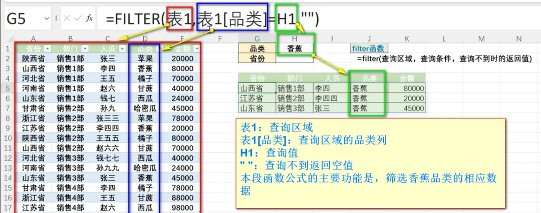 =FILTER(表1,(表1[品类]=H1)*(表1[省份]=H2),””)