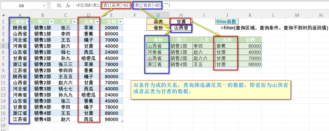 =FILTER(表1,(表1[品类]=H1)+(表1[省份]=H2),””)