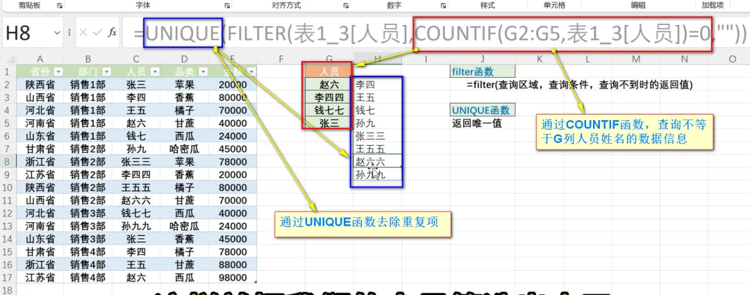 如上图,组合公式里套用了COUNTIF函数和UNIQUE函数,通过COUNTIF函数,查询不等于G列人员姓名的数据信息;通过UNIQUE函数去除重复项。