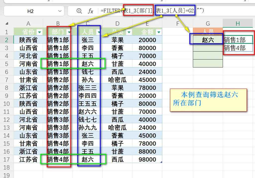 实例5:反向查询 =FILTER(表1_3[部门],表1_3[人员]=G2,””)