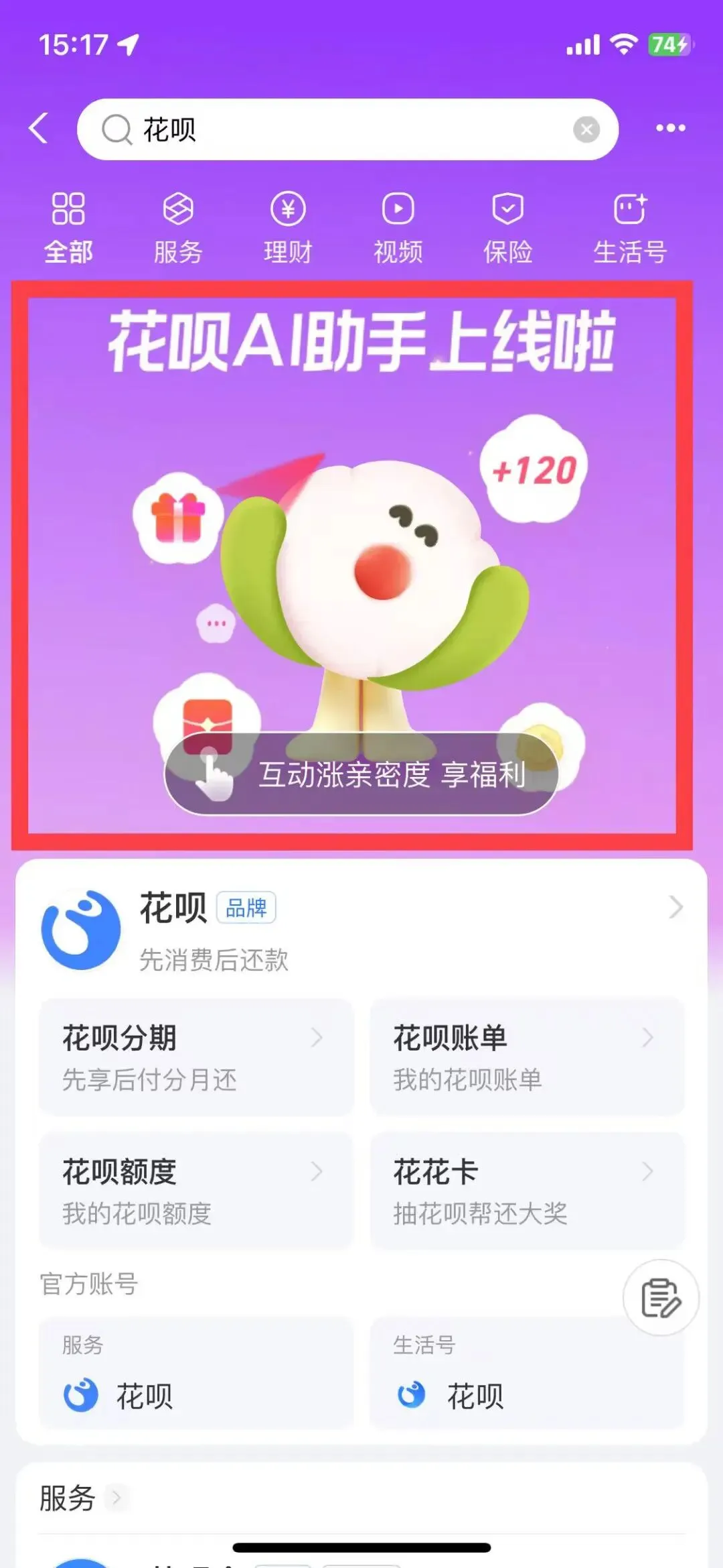 那么如何参与这项活动呢?其实非常简单。只需打开支付宝,搜索“花呗”,然后点击页面上的横幅“花呗AI助手上线啦”,