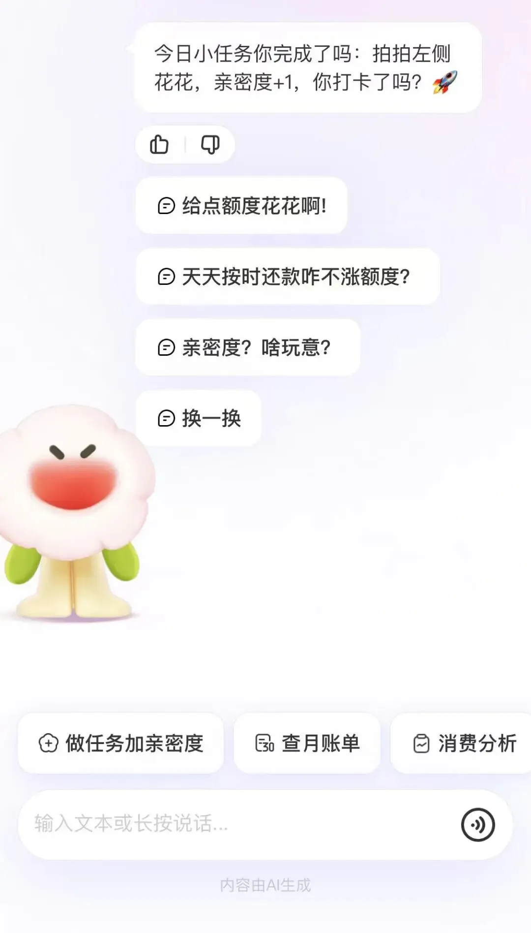 花呗AI助手的推出,不仅为用户带来了更多的便利和优惠,还通过亲密度系统鼓励用户更加频繁地使用花呗服务。这种创新的互动方式,使得用户在享受消费的同时,也能感受到与花呗之间不断增长的“亲密度”。随着亲密度的提升,用户有望解锁更多专享权益,从而获得更加个性化和优质的体验。
