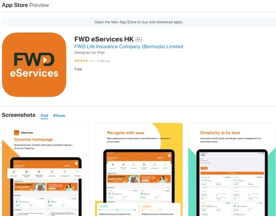苹果手机用户:可以直接在App Store【FWD eServices HK】也可以直接点击下方链接下载:https://apps.apple.com/us/app/fwd-eservices-hk/id660651836