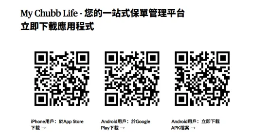 苹果手机用户:可以直接扫描下方对应的二维码下载,或者直接在App Store 搜【My Chubb Life】下载。