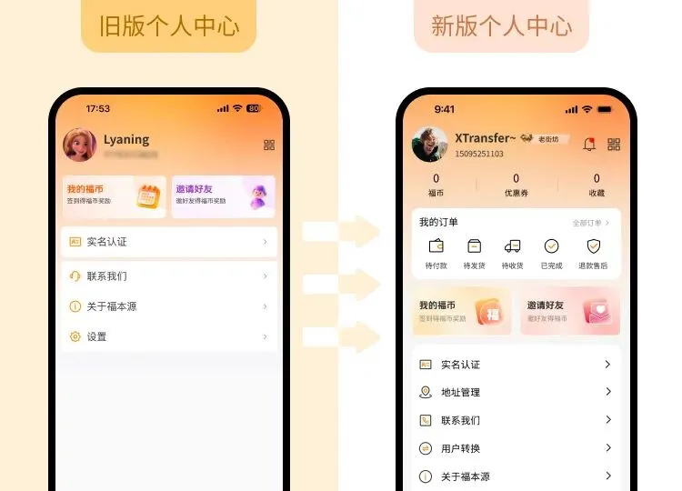 1、福本源个人中心页面改版,商城–个人中心整合至福本源–个人中心
