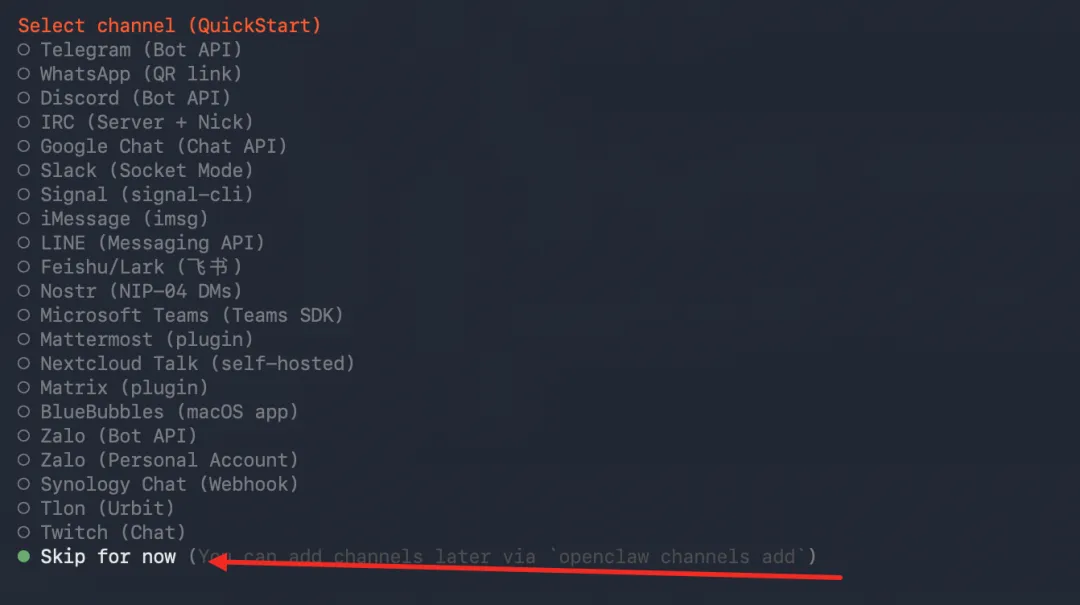第五步:添加渠道,我们先跳过,后续在添加飞书