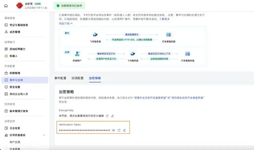 这里有一个问题:如果你使用connectionMode: “webhook”,请同时设置verificationToken和encryptKey。Feishu webhook服务器默认绑定到 127.0.0.1;只有在你明确需要不同绑定地址时才设置webhookHost,所以需要用verificationToken进行配置化,这样时间回调才能起作用。