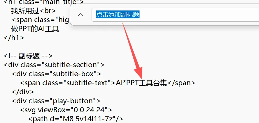比如这个封面设计,我副标题没告诉它,但是我又想添加一个副标题,直接搜索:点击添加副标题,搜到这个文字,修改成你需要填写的文字即可。