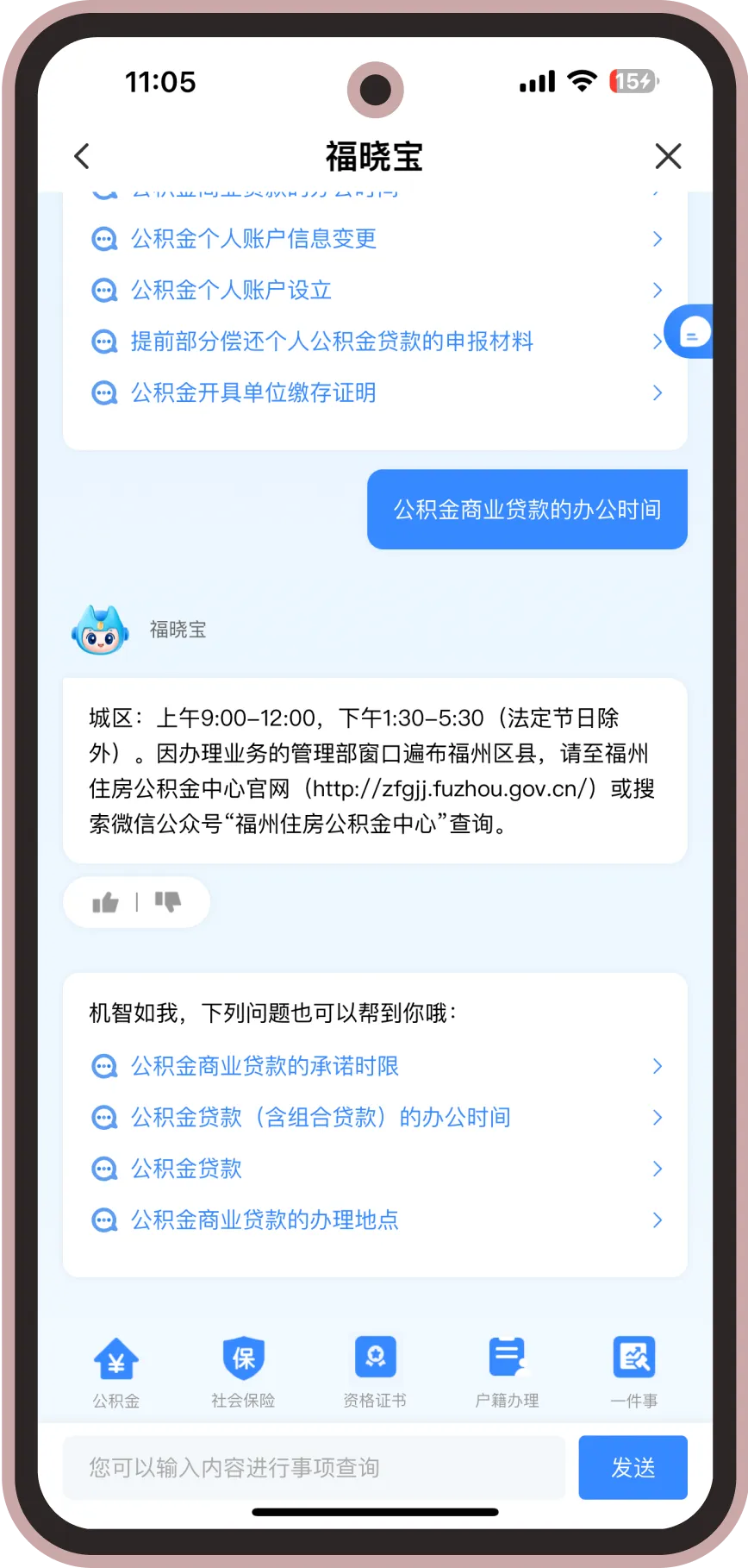 服务有疑问?智能客服来帮您!新版闽政通APP创新人工智能服务应用,引入目前热门的大模型、自然语言处理等人工智能技术,全新打造了智能客服——“福晓宝”,致力打造全场景、交互式、更精准的智能服务新体验,“福晓宝”目前可覆盖服务全省公积金、社保等8000多个政务事项和便民应用。