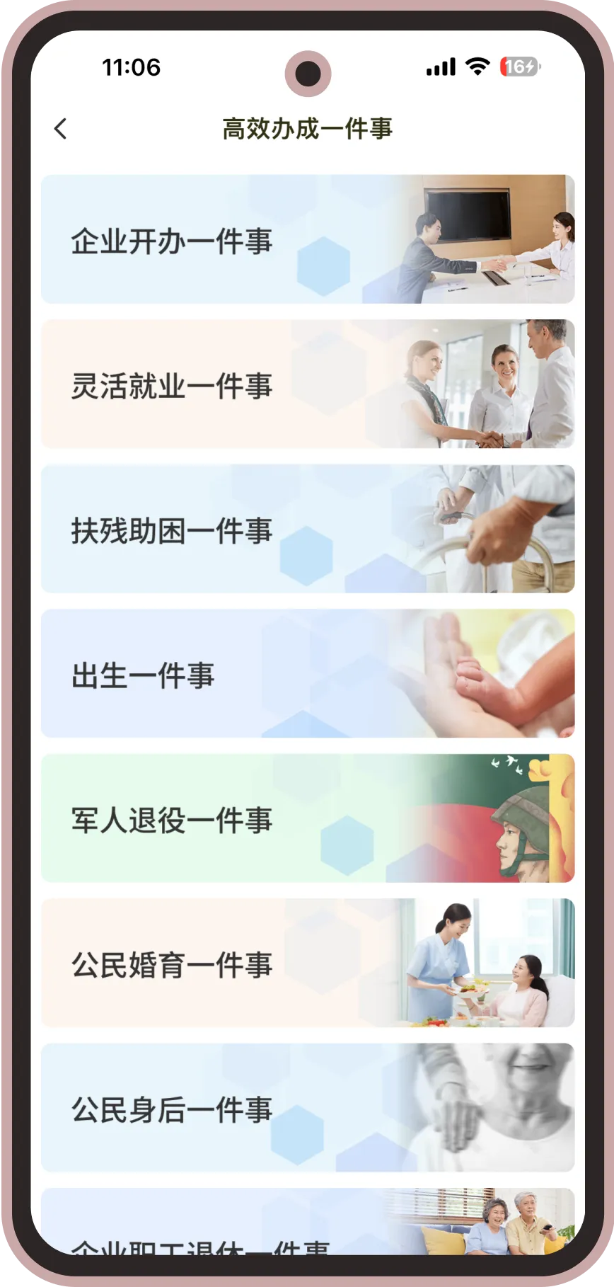 从企业和群众办事视角出发,通过强化数据共享、深化业务协同、重塑办事流程,推动申请表单多表合一、掌上一网申请、材料一次提交,实现集成办、一次办,减少办事环节、申请材料、办理时间和跑动次数。首批推出了13个“高效办成一件事”,覆盖新生儿出生、企业开办等,为企业和群众提供“一件事一次办”“一类事一站办”服务。