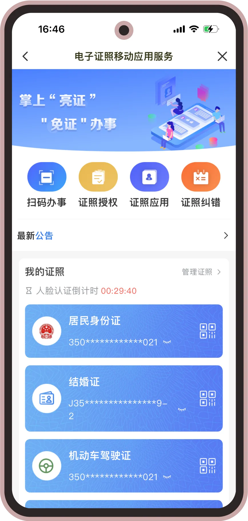 新版“闽政通”通过优化算法、提升能力,对用户的身份核验更快更高效。完成了30类超700万本高频电子证照治理,可为全省提供2.3亿本的电子证照服务,覆盖居民身份证、营业执照、结婚证、出生医学证照、不动产权证等,有力支撑企业、群众“免证办”“材料免提交”。优化了自然人电子签章功能,群众可以在线领取个人移动数字证书,并使用电子签章办理业务,打通全程网办“最后一公里”。