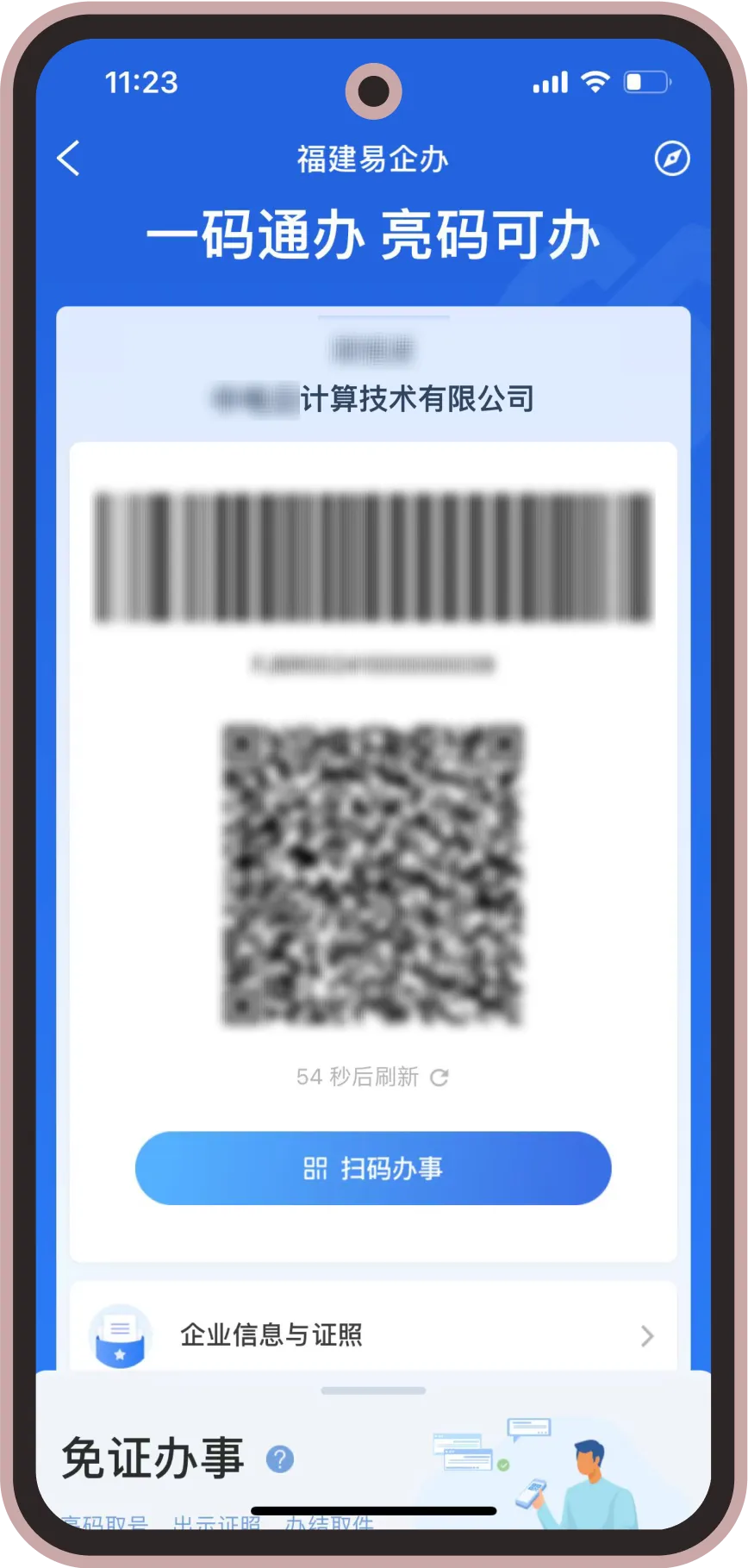“福建易企办”全面联通人口库、法人库、社会信用库、电子证照库等基础数据库,实现企业数据、电子证照等信息共享互认。率先打通个人与法人统一身份认证体系,实现用户端无感切换。以“福建码”为基础,构建“免证‘码上办’”数字能力,支撑企业线上授权管理,线下亮码办事,企业经办人经法定代表人授权后,在政务大厅服务窗口出示“企业码”即可免证办事,简化信息填报和材料提交流程,免验实体证照,“一事一授权”,让“企业码”成为企业办事的“身份证”和“通行证”。