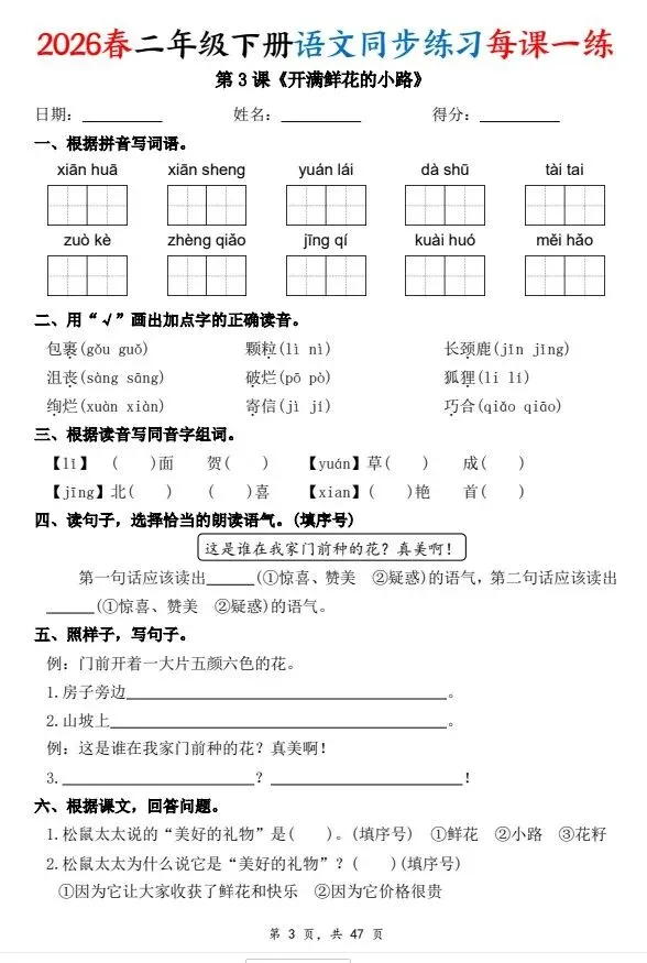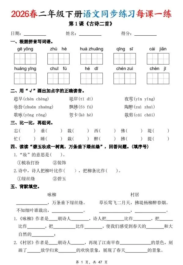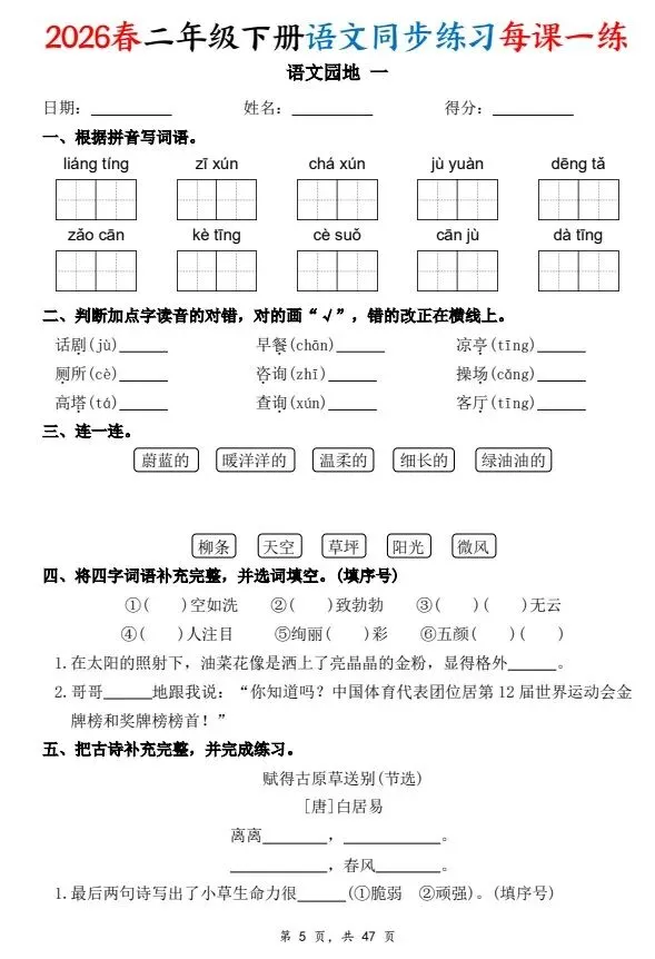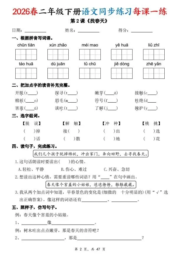 二下语文每课一练同步练习,