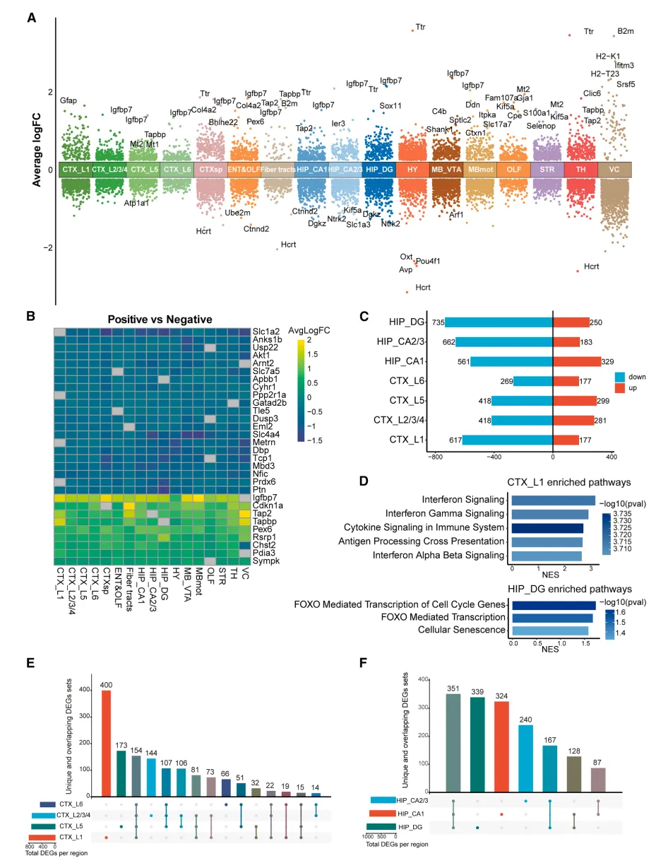 2、在所有脑区阳性和阴性大脑之间鉴定差异表达基因(DEGs)。