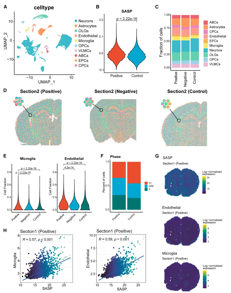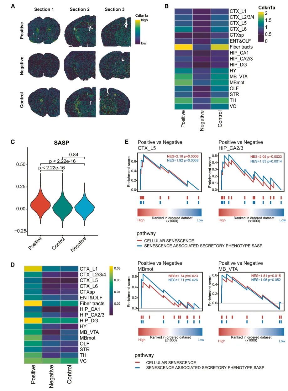 2、生信分析:先通过空间转录组找脑区特异性差异基因/通路,再用 snRNA-seq 解析细胞层面变化,结合反卷积、细胞通讯、转录因子分析等,锁定衰老相关核心靶点(APP-CD74/IGFBP7/CDKN1A)及关键细胞。