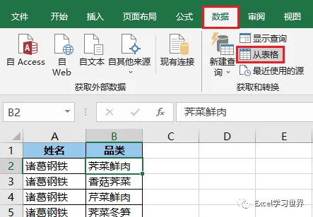 1. 选中数据表的任意单元格 –> 选择菜单栏的“数据”–>“从表格”