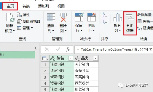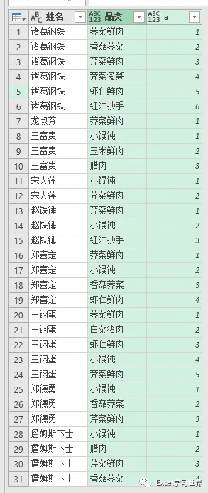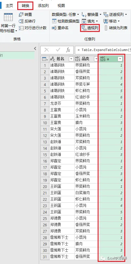 7. 选中 a 列 –> 选择菜单栏的“转换”–>“透视列”