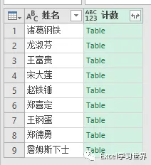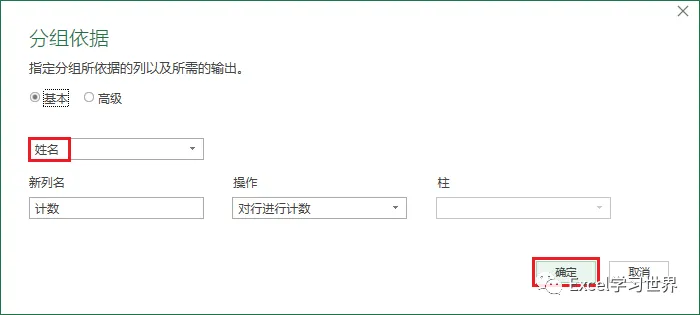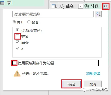 6. 点开“计数”旁边的扩展钮 –> 在弹出的菜单中取消勾选“姓名”和“使用原始列名作为前缀”–> 点击“确定”