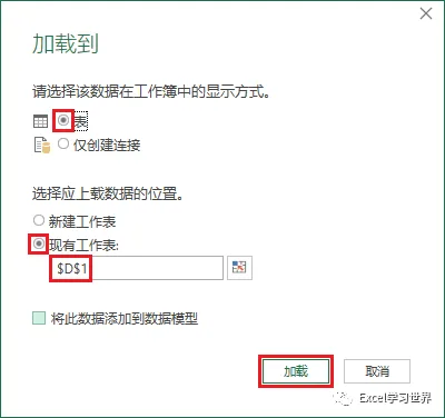 10. 在弹出的对话框中选择“表”–> 选择“现有工作表”及所需上传至的位置 –> 点击“加载”