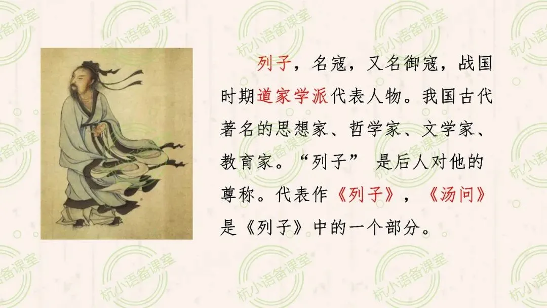 列子,名寇,又名御寇,战国时期道家学派代表人物。我国古代著名的思想家、哲学家、文学家、教育家。“列子” 是后人对他的尊称。代表作《列子》,《汤问》是《列子》中的一个部分。