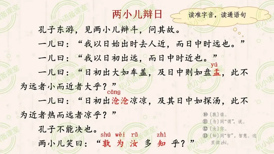 2.能运用参考注释等多种方法,理解字句意思,借助思维导图梳理两小儿辩日的观点和依据。 (重点)