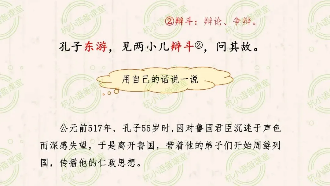 出示资料:公元前517年, 孔子55岁时,因对鲁国君臣沉迷于声色而深感失望,于是离开鲁国,带着他的弟子们开始周游列国,传播他的仁政思想。在这个过程中,相传见证了两小儿的一场激烈的辩论。