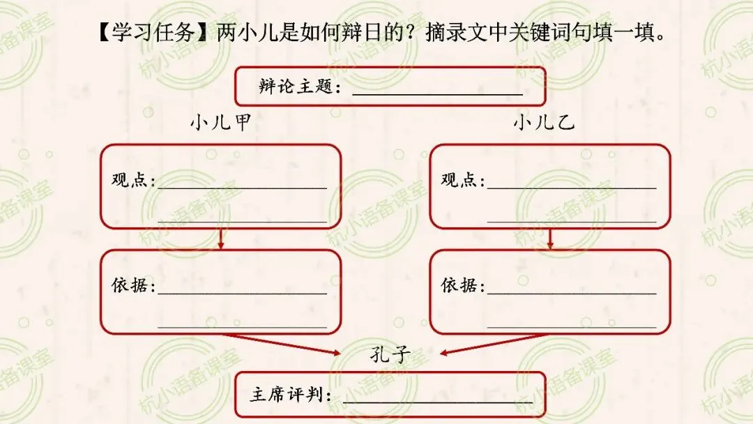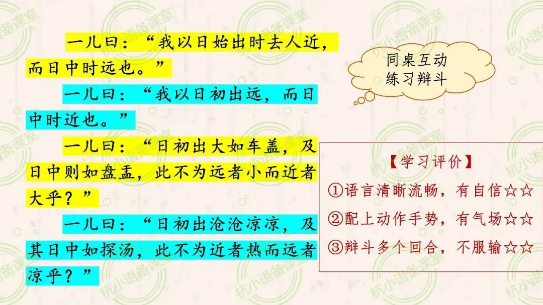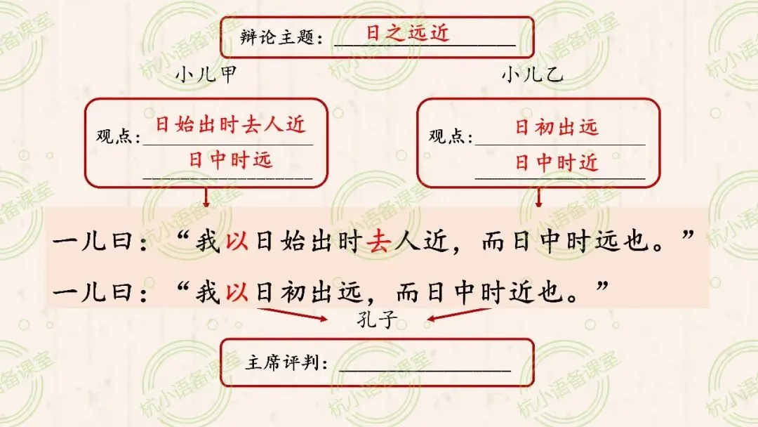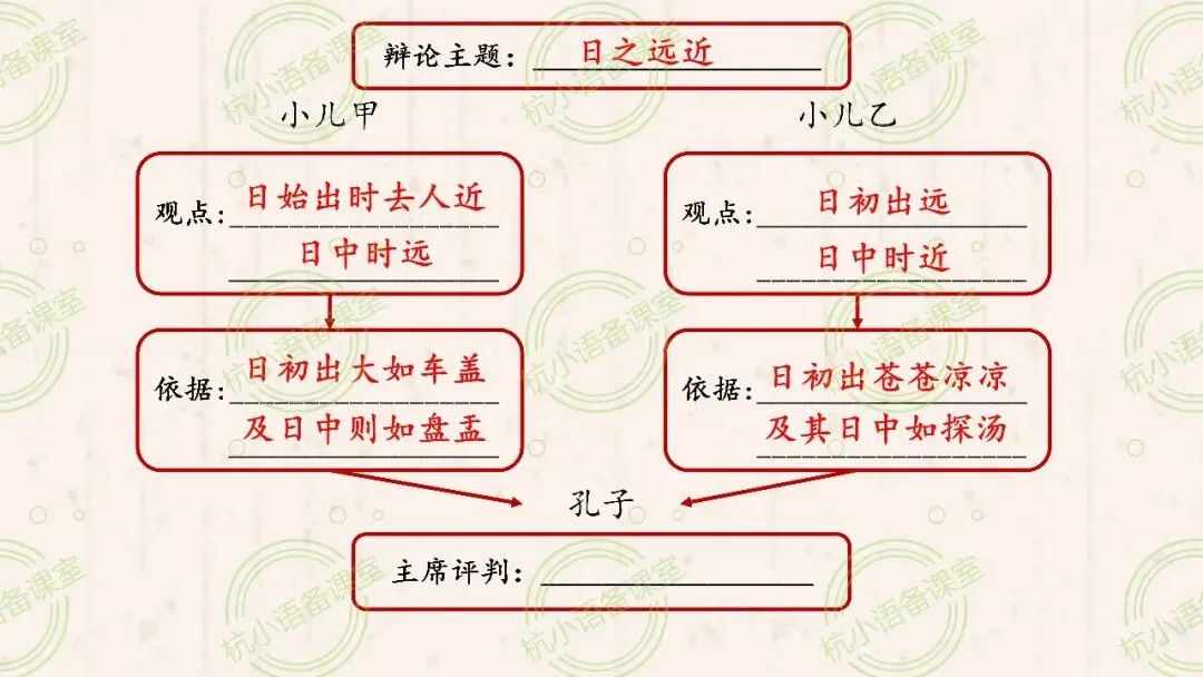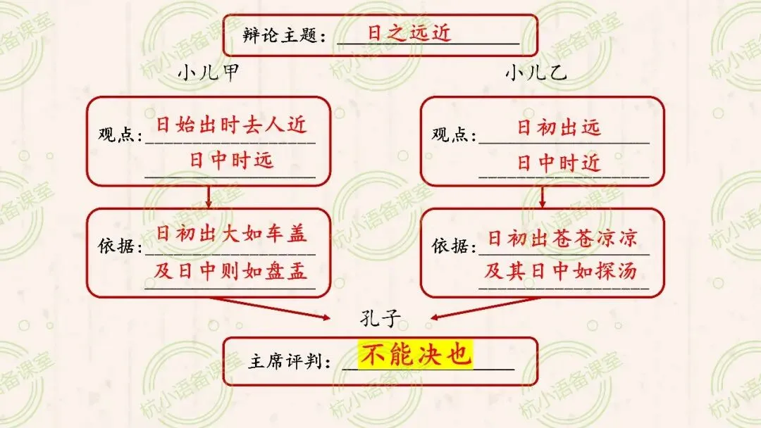 (2)辩论,一般有正方和反方,双方会有不同的观点。那么,小儿甲和小儿乙各自的观点分别是什么呢?