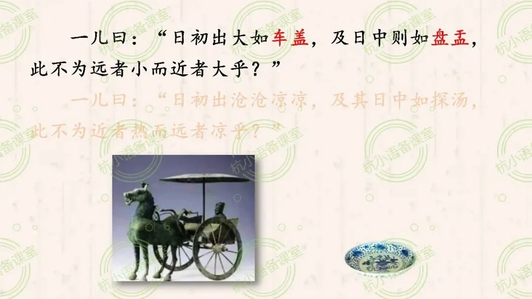 出示图片,了解“车盖”和“盘盂”。然后用自己的话说说小儿甲的依据。