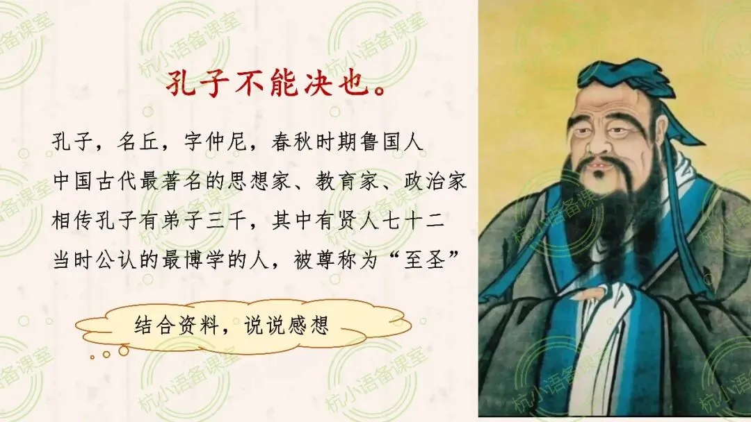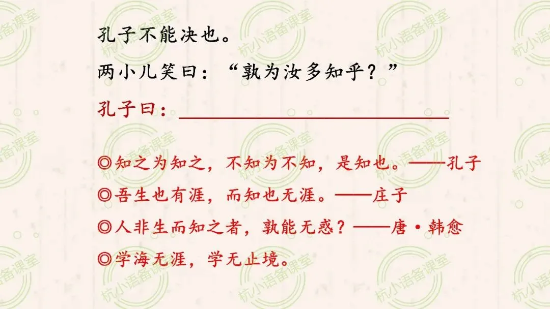 设计意图:聚焦孔子“不能决也”和两小儿的反问,结合孔子背景和经典名言,引导学生体会孔子的品质,挖掘故事蕴含的“学无止境”道理,实现人文素养的渗透。