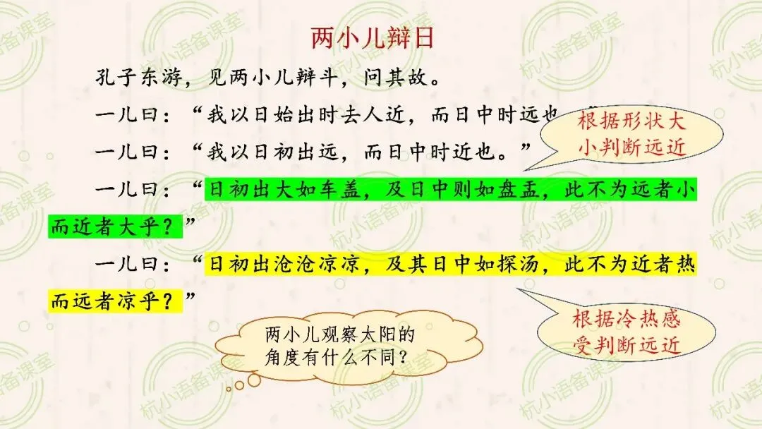 交流,预设:小儿甲根据形状大小来判断远近。小儿乙根据冷热感受来判断远近。角度不同,观点也就不同。