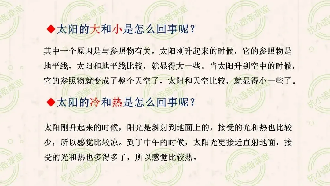 其中一个原因是与参照物有关。太阳刚升起来的时候,它的参照物是地平线,太阳和地平线比较,就显得大一些。当太阳升到空中的时候,它的参照物就变成了整个天空了,太阳和天空比较,就显得小一些了。