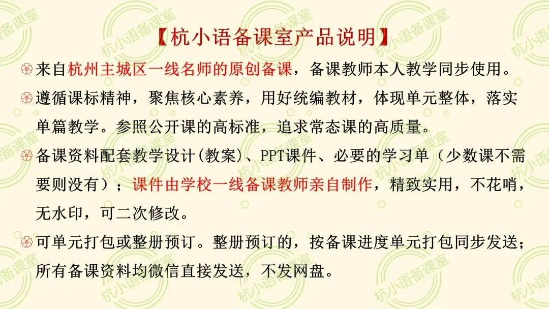 本号一贯坚持原创备课,目前未与其他任何个人、机构、自媒体、公众号开展业务合作。其他打着“杭小语”“杭小语备课”旗号的,多为误导、欺诈行为。请认准【杭小语备课室】公众号,谨防被骗!
