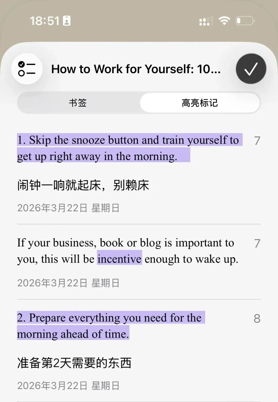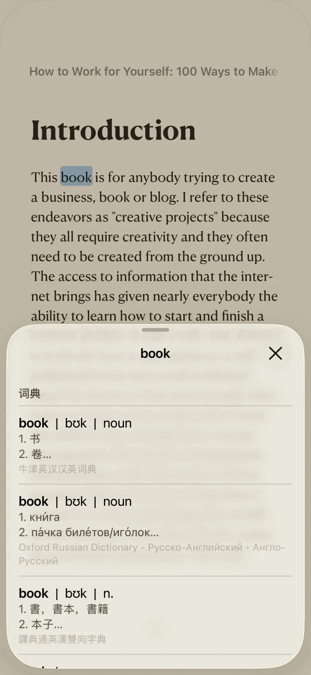 对于学英语这件事,我犹豫了好久。一方面现在AI这么好用,一本几百页的pdf,它都分分钟给你翻译成汉语。还有必要学英语吗?另一方面,自己人到中年,也学不动了。学它干嘛?工作上也用不上。不过后来听说学一门外语,在不同语境中切换,对大脑的效果等同于打麻将,可以有效预防老年痴呆。emm,那我就再“努力”一下吧。作为一个懒人,并且还很抠,我发现手机上这款自带app,倒是能让人无痛学英语。这个app就是“图书”,这么宝藏好用,原来还真是忽略了它。使用方法:首先,在网站上下载英文原著,用“图书”打开,这样就直接导入了。已经导入的书在下方的“书库”即可查看。如果遇到生词,由于手机自带词典,长按住生词,就可以查询了。选中一整段,还可以在线翻译。所以阅读时候没在怕的。由于我自己本来学俄语的,所以我设置了英俄字典,在看英语什么意思的时候,还能顺便扫一眼用俄语怎么表达。词典顺序的设置在“设置”里。遇到不错的句子也可以保存下来。我一开始生词和金句都是用一样的颜色。后期习惯用不同的颜色,这样回看的时候,能很快找到自己要的信息。铛铛,我就这样无痛一周看完一本英文原著啦。还有一个额外的Tips:“图书”app上其实有很多外文书可以直接购买的,但是没有对中国ID开放。如果你能注册海外ID,就可以在上面购买有声书了。可以手机使用国内ID,图书单独使用海外ID,互不影响。我用原来国外的手机号注册了一个海外ID,不过由于没有海外银行卡,不能直接买书。关于这一点也有解决办法。可以在“闲鱼”上买充值卡,然后在“图书”的个人账户充值,这样就可以买书了。我第一本看的《How to work for yourself》。现在看的第二本是《The Snowball》,都是晚上看文字版,第二天早上听语音版。为了让体验更无痛一点,我设置了自动播放。时间设置在起床闹钟之后10min,它会自动打开,播放。手机的“快捷指令”也是个好东西,这个我下次说。虽然不知道为什么要学英语,但是真看完一本书,还是比较有成就感的。可能这就是我比较喜欢的一心二用。既然本身要看书,为什么不看英语书呢?信息也获取了,英语也学了。一点小分享。如果你有什么好用的app,也请留言推荐给我呀!