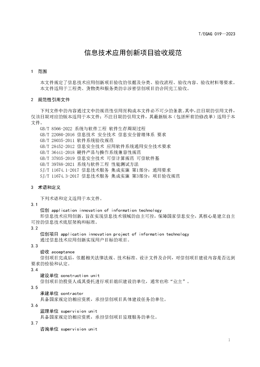 《信息技术应用创新项目验收规范》(T/EGAG 019-2023)团体标准已于2023年7月1日起正式施行