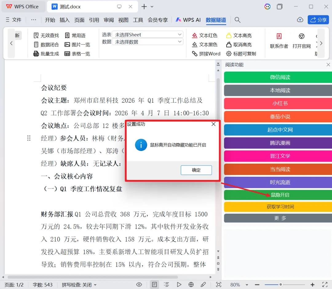 1、在 Word/WPS 顶部菜单栏点开「数据隧道」选项卡; -