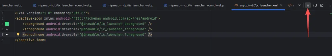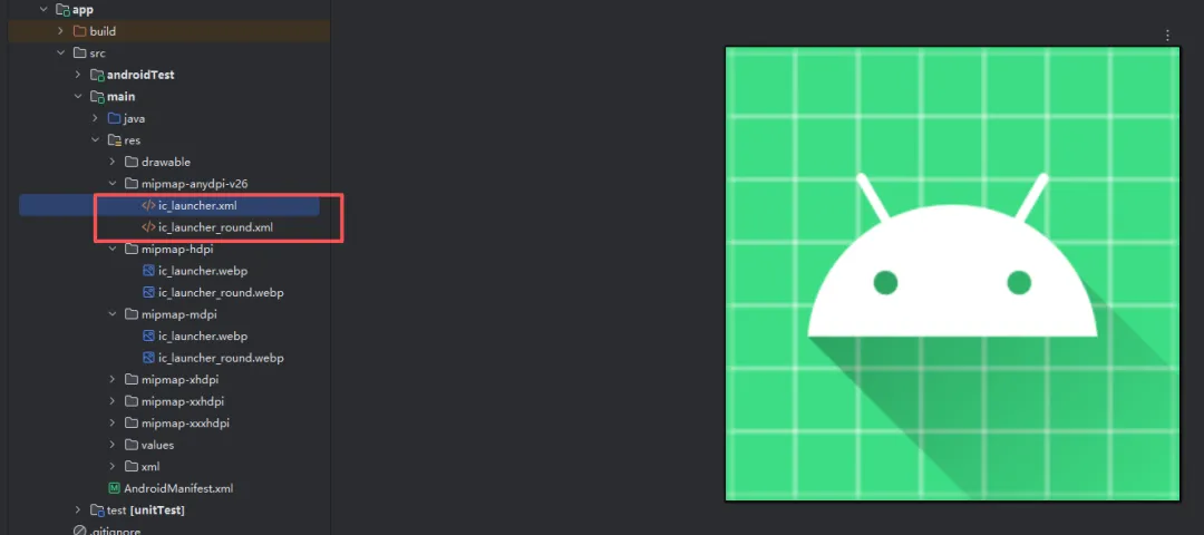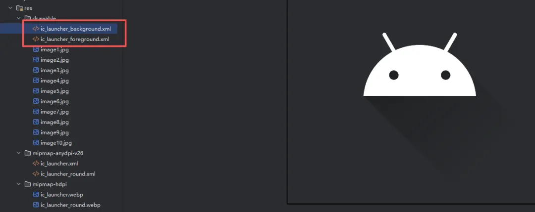 使用了<adaptive-icon>元素为应用图标的<background>背景图层和<foreground>前景图层分别提供资源可绘制对象,从而完成对它们的声明。